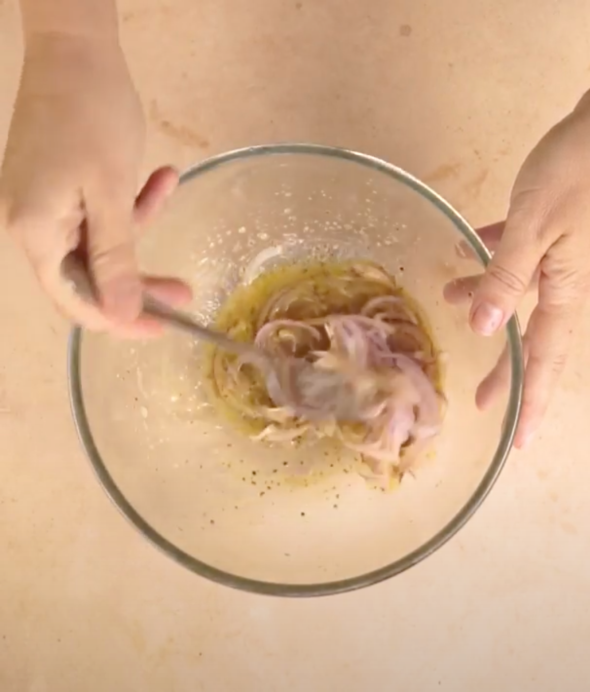 In a large bowl, whisk the olive oil, vinegar, mustard and lemon juice. Season generously with salt and pepper, stir in the red onion and set aside.