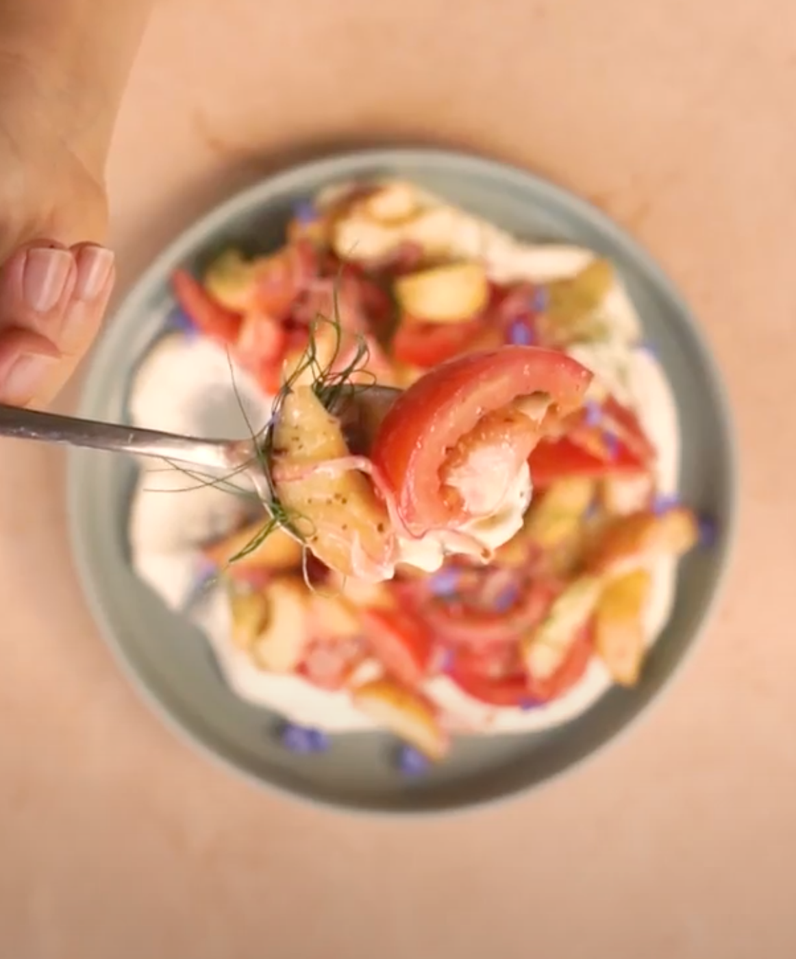 Spread the whipped goat cheese on a large serving platter or in shallow bowl, distributing it evenly using the back of a spoon. Add the dressing and onions to the tomato & peach wedges and toss to coat. Season to taste with salt and pepper. Place on top of the whipped goat cheese and serve immediately with fresh herbs and edible flowers
